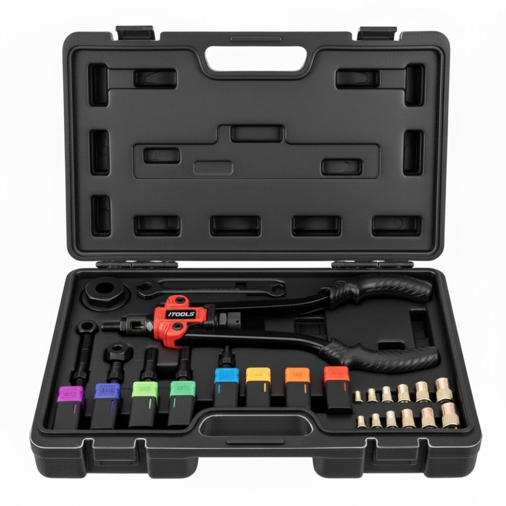 تقدم ماكينة برشام يدوية مجموعة من الأدوات التي يستخدمها العمال لتثبيت البرشام. يتيح لكم الحصول على الأدوات المطلوبة بسهولة وسرعة، بالإضافة إلى صواميل: (3-4-5-6-8-10-12) MM.